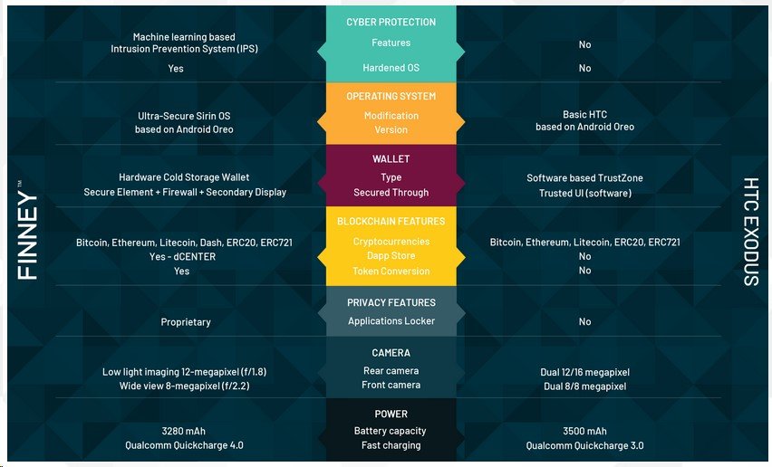 Было бы большим упущением в этой статье не сказать о криптотелефонах других производителей. Один из них – Finney от компании Sirin Labs – является конкурентом HTC EXODUS 1, о чём производитель заявляет недвусмысленно, приведя сравнительную таблицу.