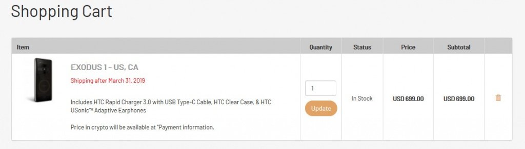 В качестве дополнительного рекламного «усилителя» блокчейн-смартфон HTC EXODUS 1 для предзаказа может быть оплачен исключительно в криптовалюте. Впрочем, нажав кнопку «CRYPTO» и перейдя на страницу оплаты, покупатель узнаёт цену товара не в биткоинах, эфире или лайткоинах, а в долларах США.