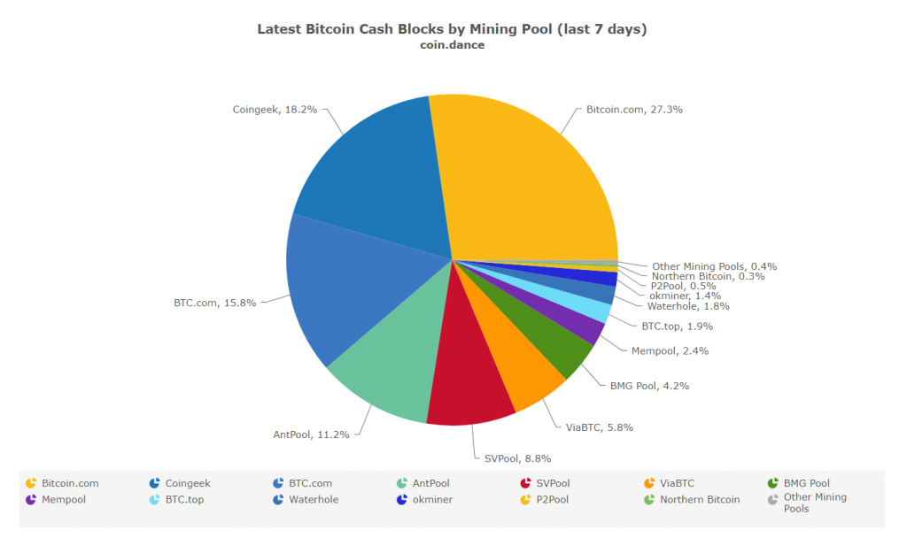 На диаграмме выше можно видеть, что подконтрольные Bitmain майнинговые пулы BTC.com, AntPool, ViaBTC создают 33% новых блоков, Bitcoin.com Роджера ВЕРА — 27.3%, а CoinGeek — только 18.2% новых блоков. При этом, если Bitmain и Bitcoin.com майнят BCHABC, то пул ЭЙРА является майнинг-монополистом в операциях с BCHSV.