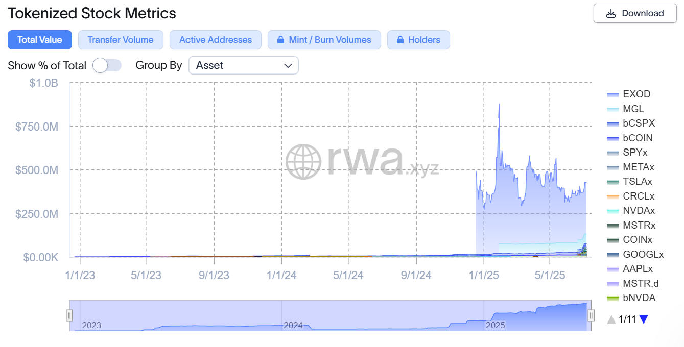 Акции составляют лишь $188 млн из $24 млрд рынка токенизации, но могут показать значительный рост в ближайшие годы. Источник: RWA.xyz