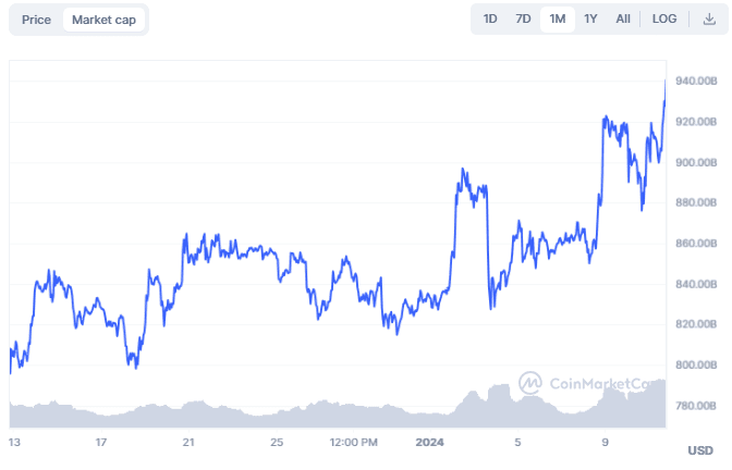 С начала января 2024 года капитализация биткоина выросла на более чем $120 млрд, по данным CoinMarketCap: