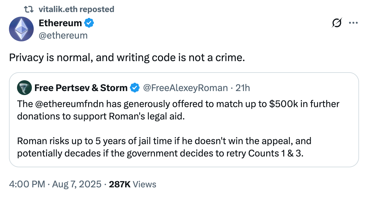 Твит официального аккаунта Ethereum в поддержку Романа Шторма. Источник: Ethereum
