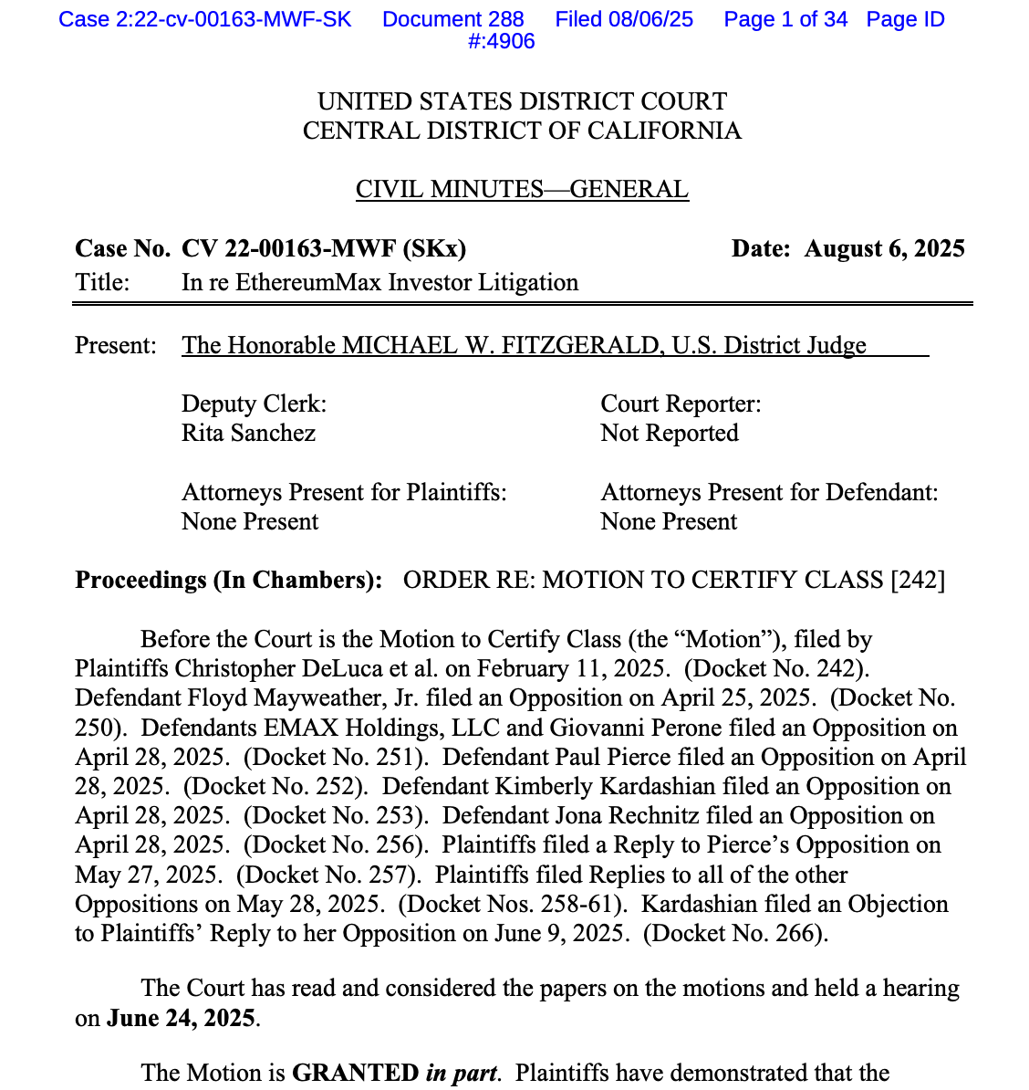 Инвесторы, участвовавшие в иске 2022 года, получили возможность продолжить судебное преследование знаменитостей, продвигавших токен EthereumMax (EMAX). Решение судьи Майкла Фицджеральда из Окружного суда США по Центральному округу Калифорнии позволяет рассматривать коллективные иски в четырех штатах, но отклоняет общенациональный коллективный иск против промоутеров EMAX.
