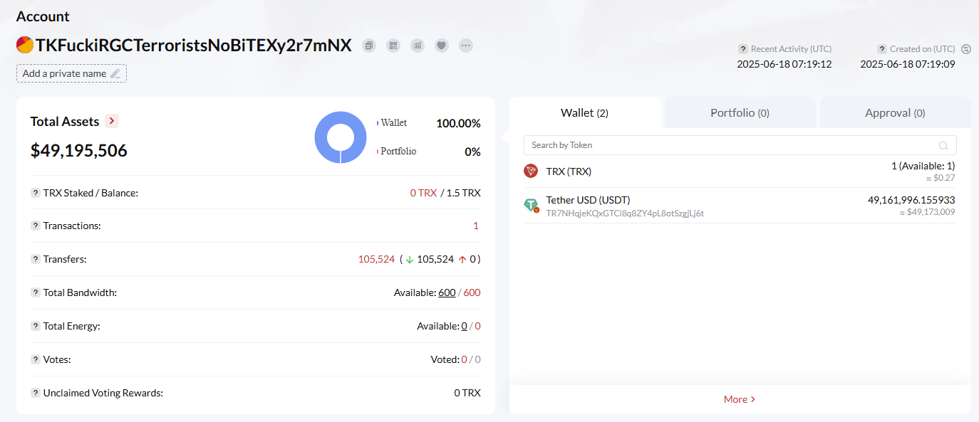 Тщеславный адрес — это публичный кошелек с заранее заданной последовательностью символов, которую пользователь может создать самостоятельно. Первый из таких адресов — TKFuckiRGCTerroristsNoBiTEXy2r7mNX — позволил хакерам вывести около $49 млн. Второй адрес — 0xffFFfFFffFFffFfFffFFffFfFffFFFFFFFFFFFFDead — также был задействован, согласно данным Tronscan.